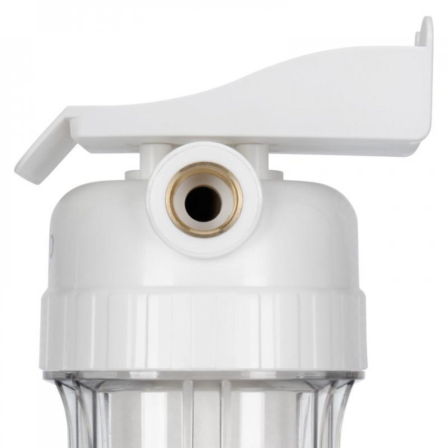 Крышка фильтра изготовлена из волокно-наполненного армированного пластика. Колба — из прозрачного небьющегося поликарбоната. Латунные резьбовые вставки увеличенной толщины добавляют надежности.