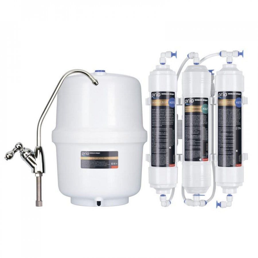 В комплект уже входят картриджи и мембрана, отдельный кран для очищенной воды, накопительный бак ёмкостью 3,25 л и всё необходимое для быстрой установки фильтра на месте эксплуатации.