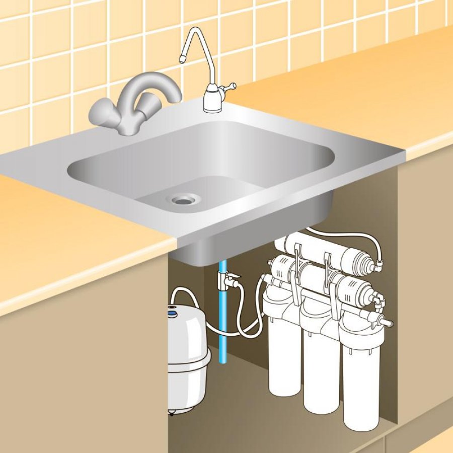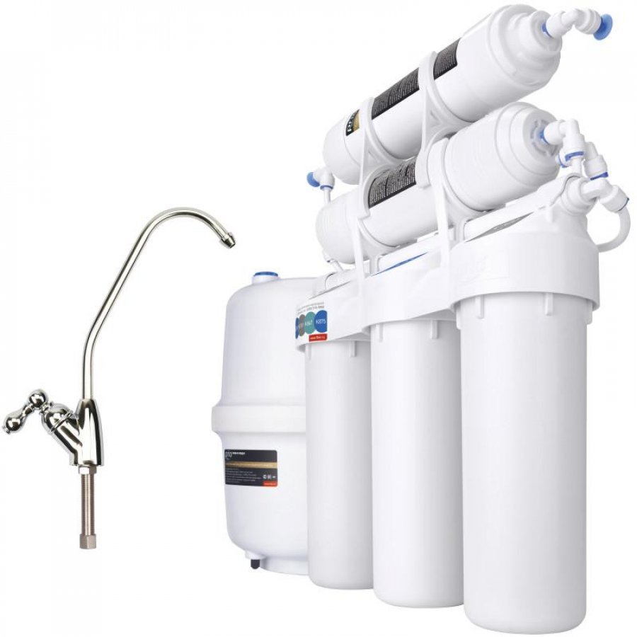 В комплект уже входят картриджи и мембрана, отдельный кран для очищенной воды, накопительный бак и всё необходимое для быстрой установки фильтра на месте эксплуатации.