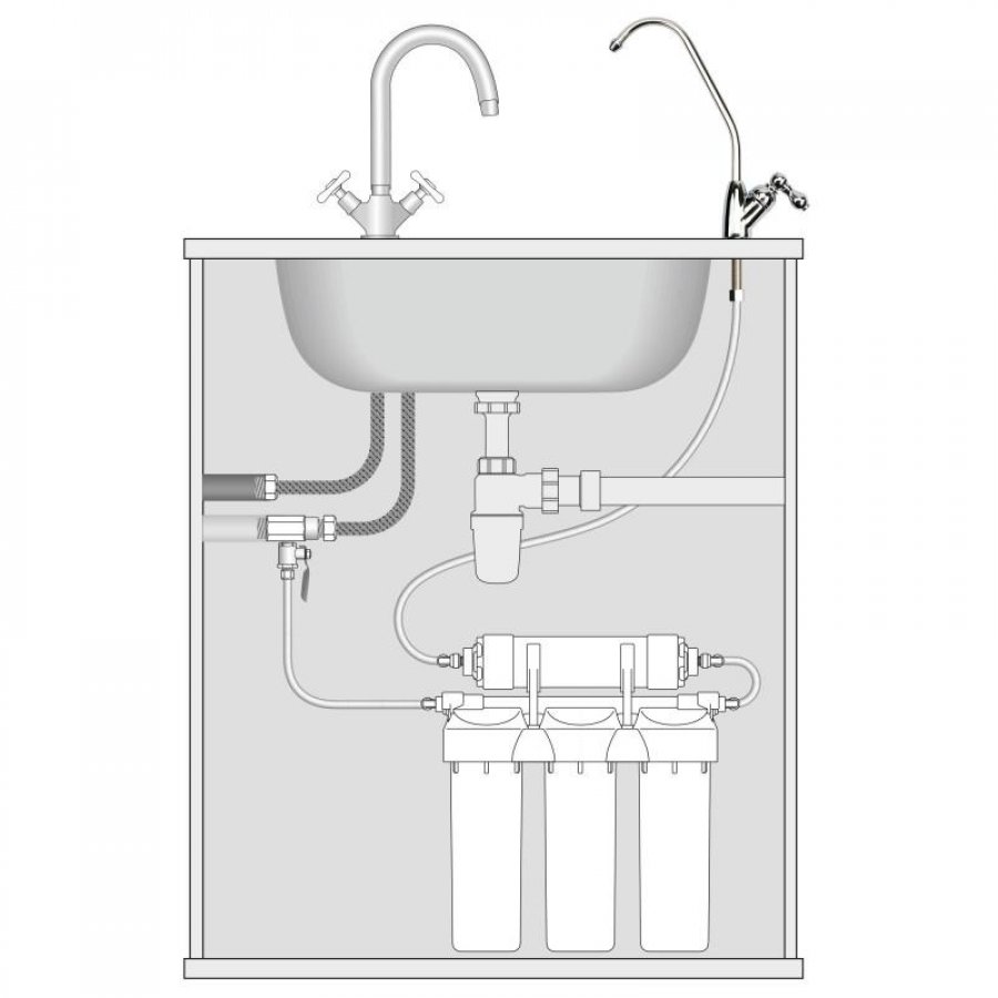 Они подключаются стационарно в водопровод холодной воды у точки потребления воды (обычно под кухонной мойкой) с выводом наверх отдельного крана для очищенной воды. При этом водопроводная вода проходит последовательно через несколько фильтрующих картриджей и подается очищенной через отдельный кран при его открытии в режиме «по требованию».
