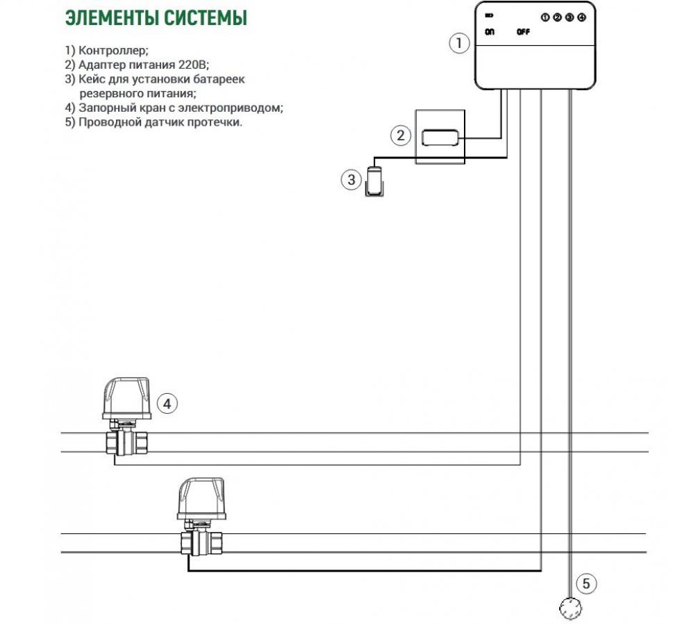 Контроллер включает звуковой сигнал тревоги и автоматически перекрывает подачу воды с помощью запорных кранов с электроприводом, смонтированных
