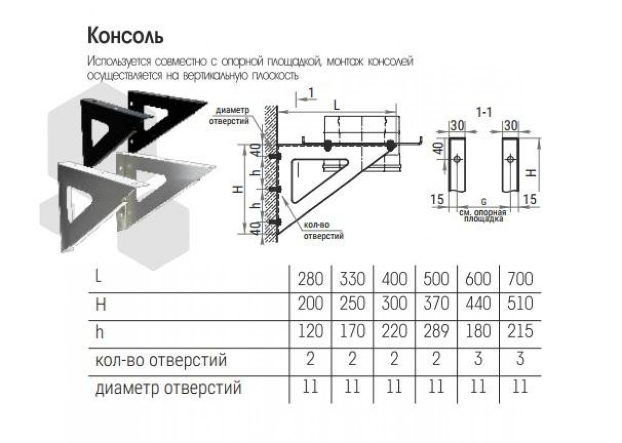 Используется совместно с опорной площадкой. Монтаж консолей осуществляется на вертикальную плоскость.