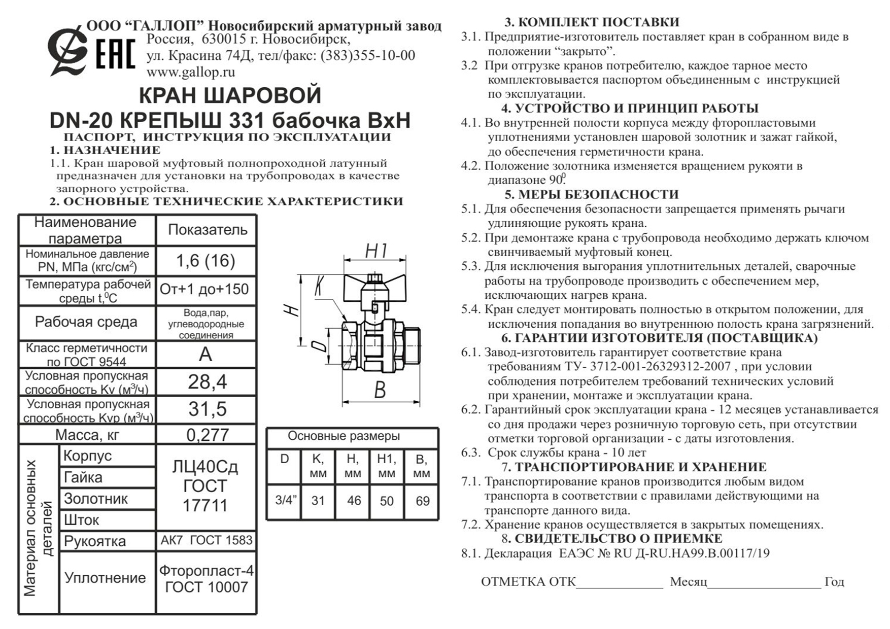 Материал корпусных деталей: латунь ЛЦ40Сд по ГОСТ 11711.