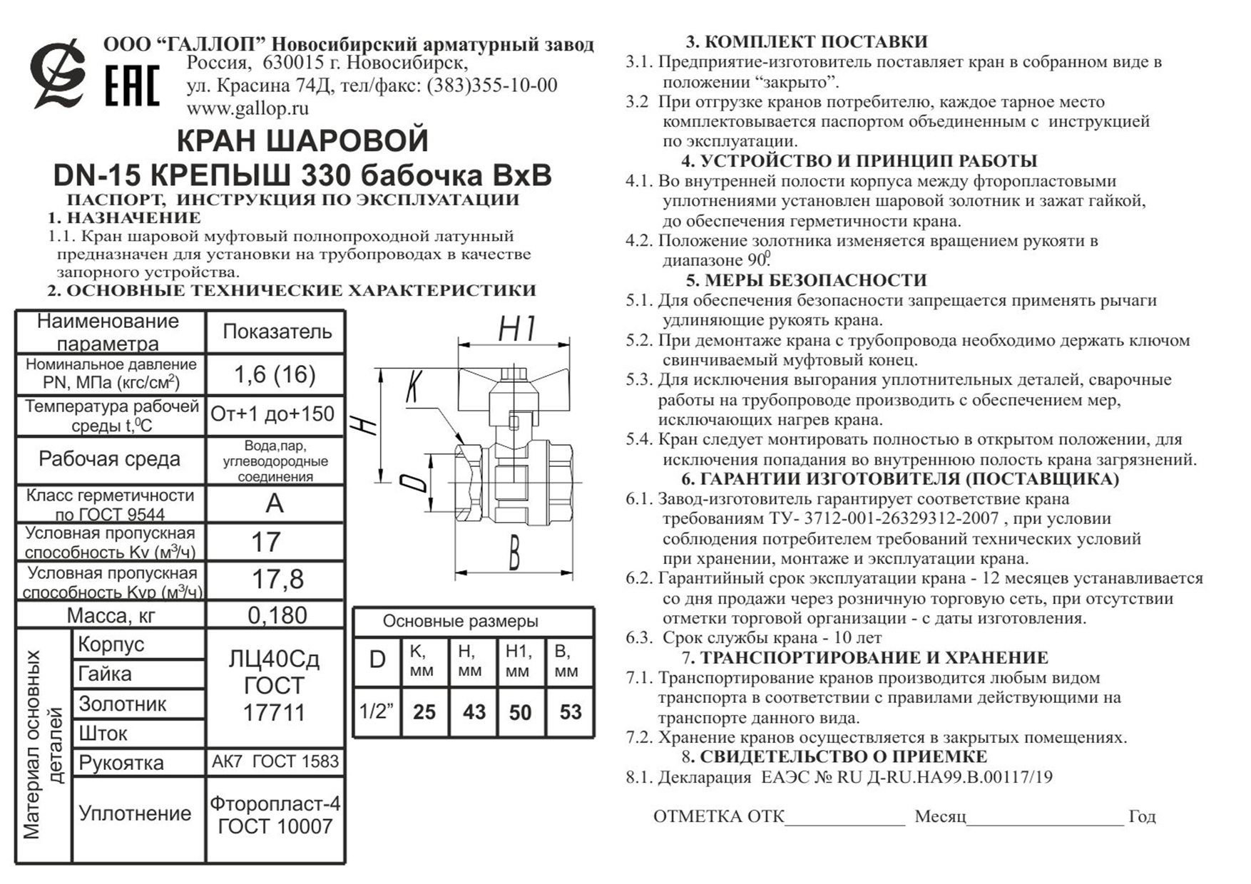 Материал корпусных деталей: латунь ЛЦ40Сд по ГОСТ 11711.