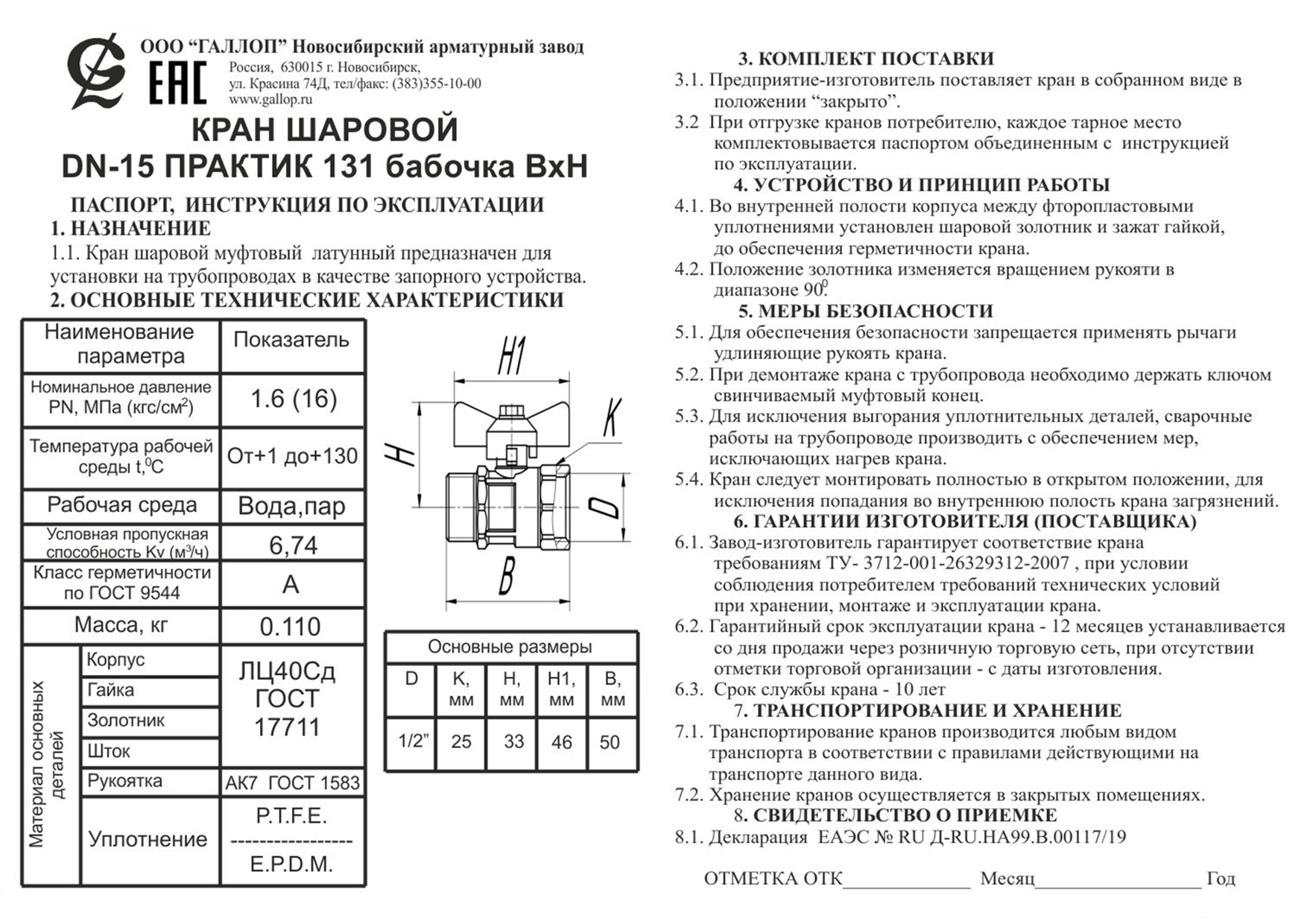 Материал корпусных деталей: латунь ЛЦ40Сд по ГОСТ 11711.