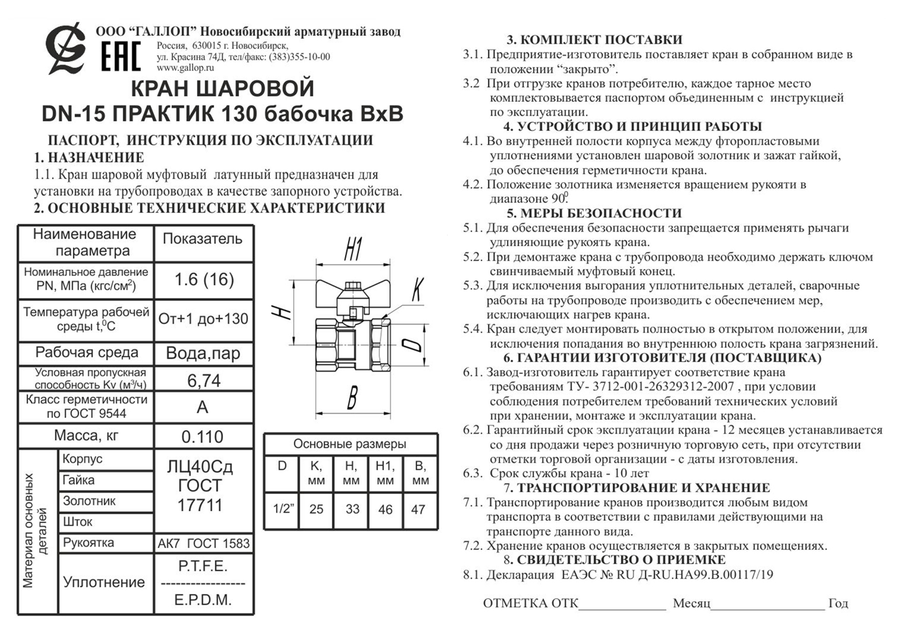 Кран шаровой вн.-вн. DN-15 баб. Практик 130 Никель (0103293) ГАЛЛОП