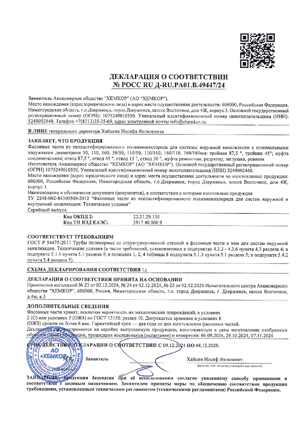 Хемкор - один из крупнейших в России производителей труб и фасонных изделий из НПВХ (непластифицированный поливинилхлорид) для напорных систем водоснабжения, наружных и внутренних канализационных систем, а также обсадных труб и напорных шлангов LayFlat (гибкие трубопроводы из ПВХ).