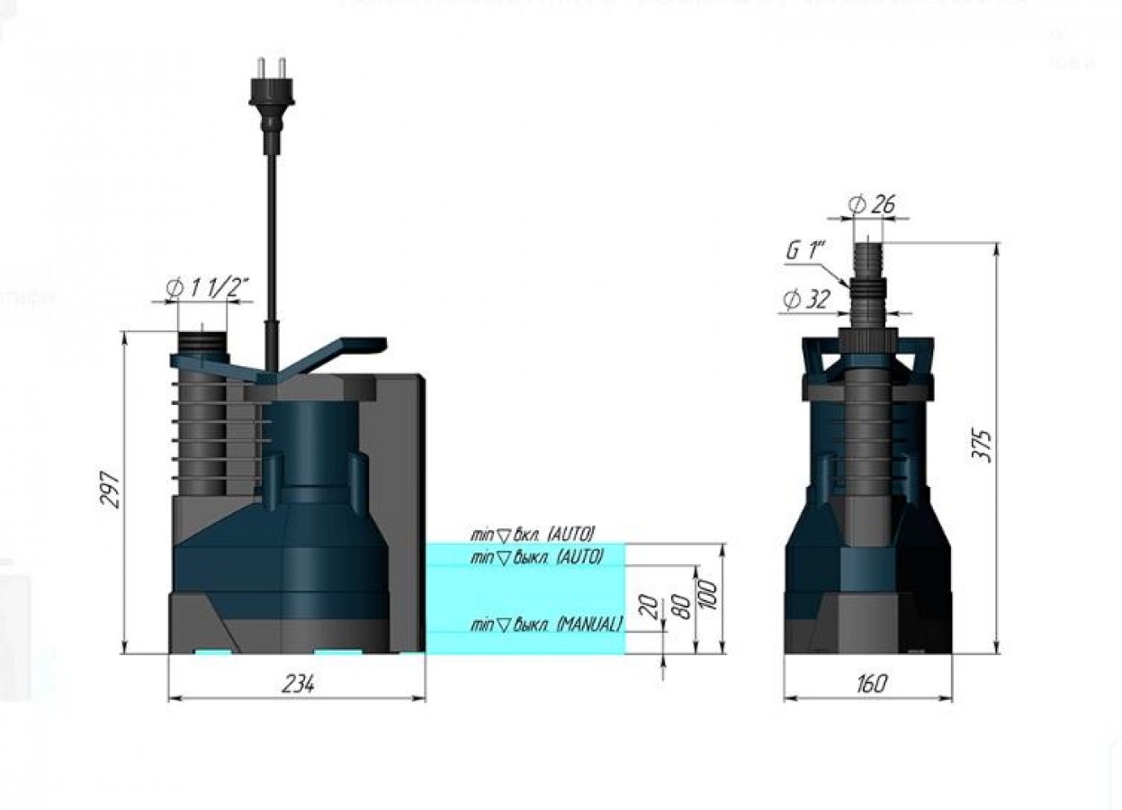 Модели имеют два режима работы – автоматический и ручной. Выбор режима работы происходит с помощью переключателя. Уровни автоматического включения и выключения насоса настраиваются с помощью регулятора.
