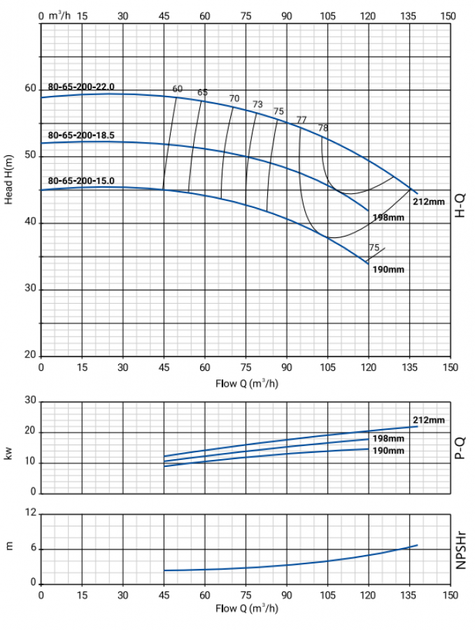 Присоединение трубопроводов к насосу фланцевое. Размеры и номинальные характеристики соответствуют стандарту EN 733. Подача насосов составляет от 0 до 500 м3/ч, напор от 0 до 131 м. Температура перекачиваемой жидкости от -10 °С до +120 °С.
