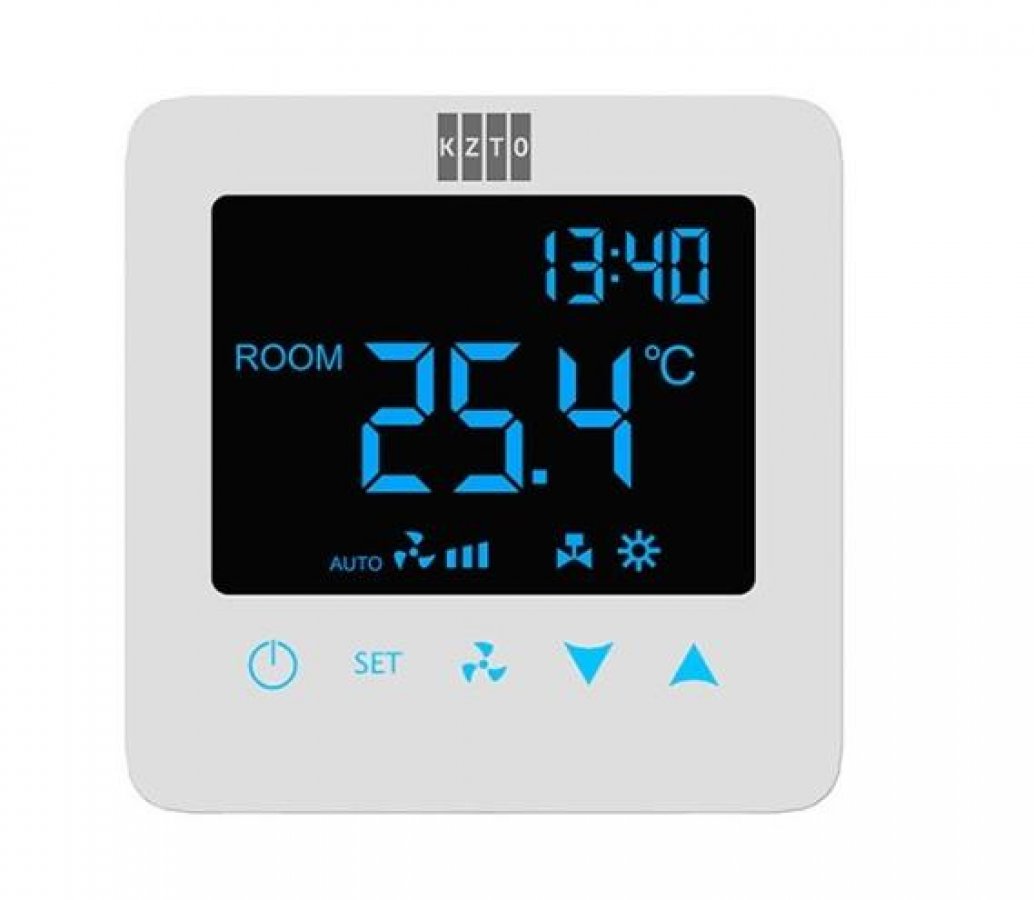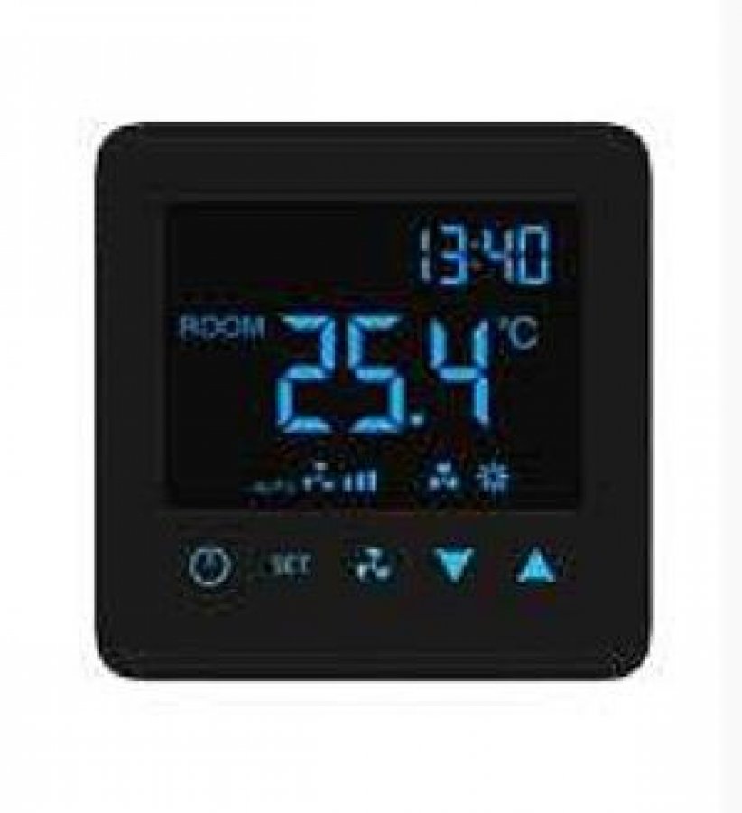 Электронный цифровой термостат предназначен для поддержания заданной температуры в помещении путем управления плавным изменением скорости вращения встроенных в тепловое оборудование вентиляторов и включением-выключением сервоприводов термовентилей.