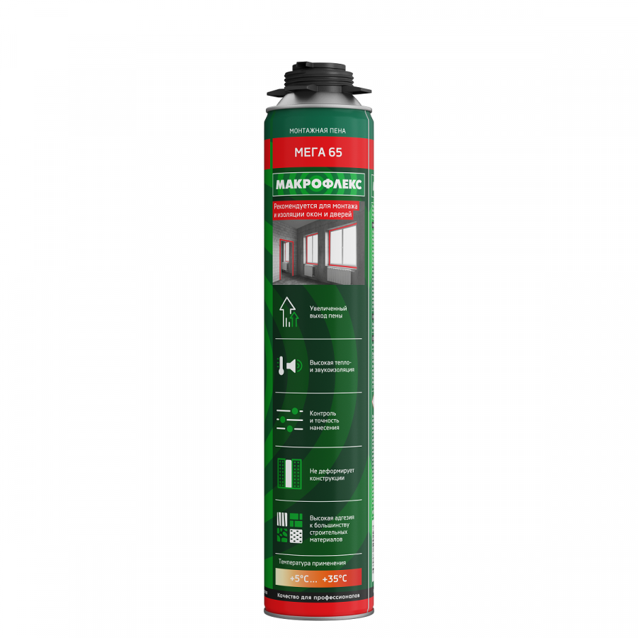 Высококачественная однокомпонентная, отверждаемая за счет реакции с влагой воздуха, полиуретановая пена с увеличенным выходом с превосходным соотношением открытых-закрытых ячеек и высокой механической прочностью. Наносится при помощи специального монтажного пистолета.