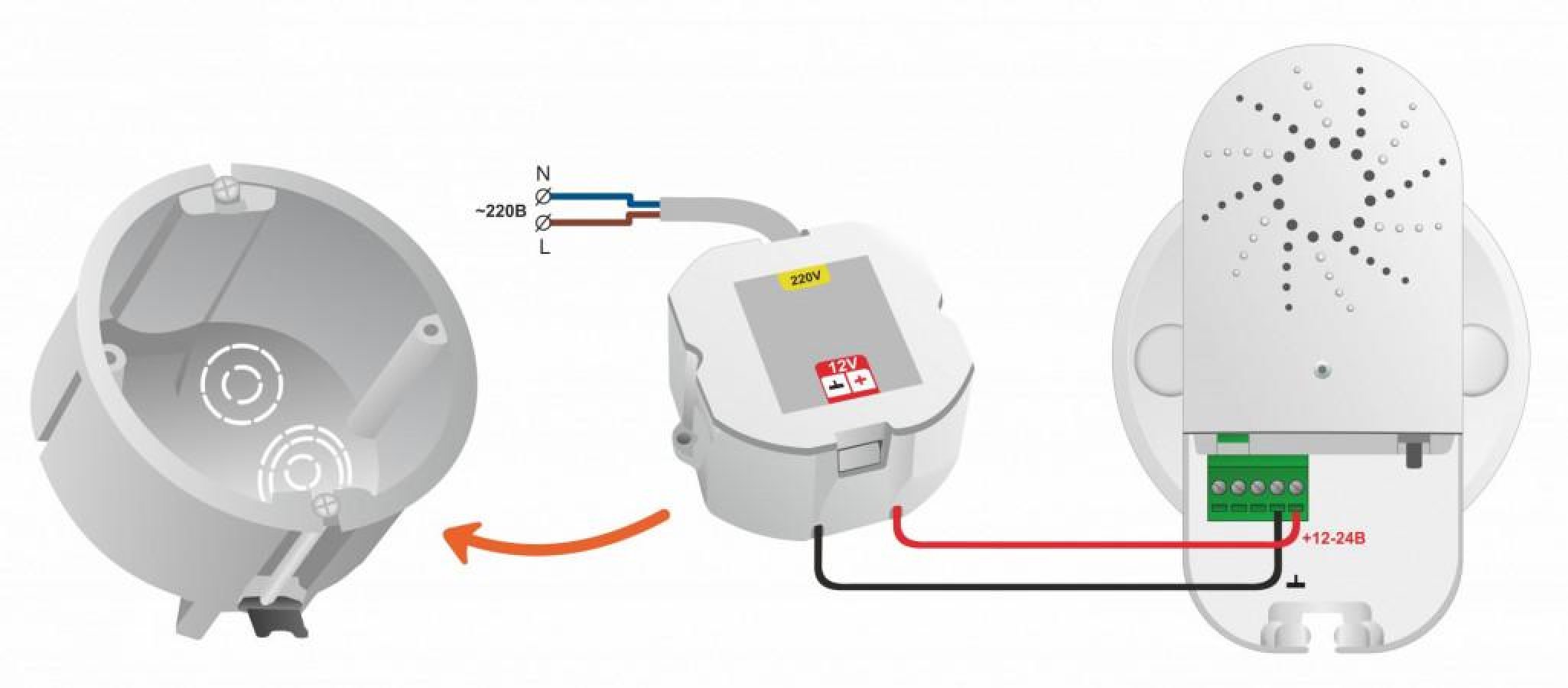 В качестве источника основного питания используется блок питания в подрозетник 12V/220 (арт.ML00006216, не входит в комплект поставки) или любой другой блок питания с аналогичными характеристиками.