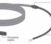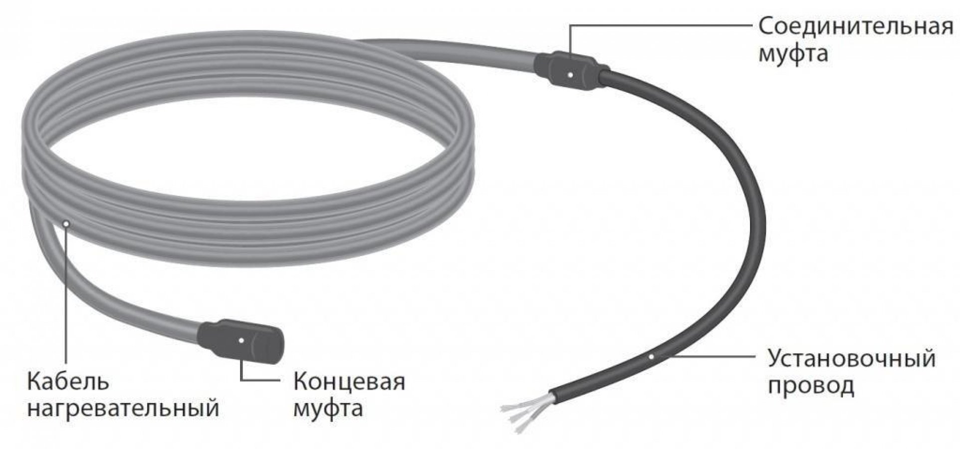 Секция нагревательная состоит из двухжильного нагревательного кабеля, с одной стороны которого установлена концевая муфта, а с другой – соединительная муфта и установочный провод. С помощью соединительной муфты установочный провод электрически и механически соединяется с нагревательным кабелем. Цвет изоляции жил установочного провода: желто-зеленый – экран, синий и коричневый – нагревательная жила.