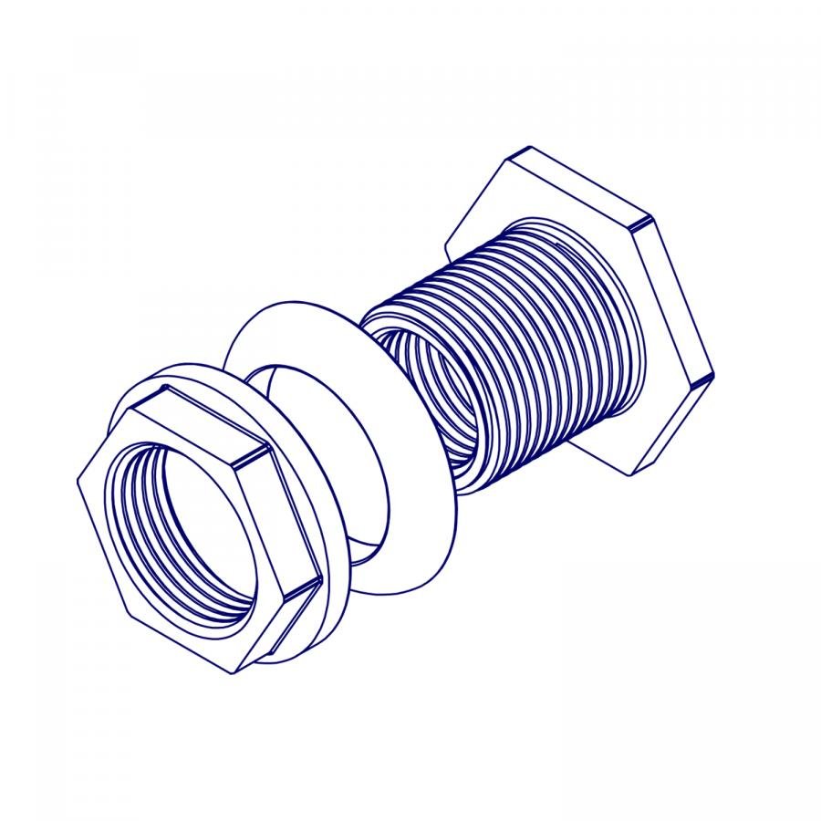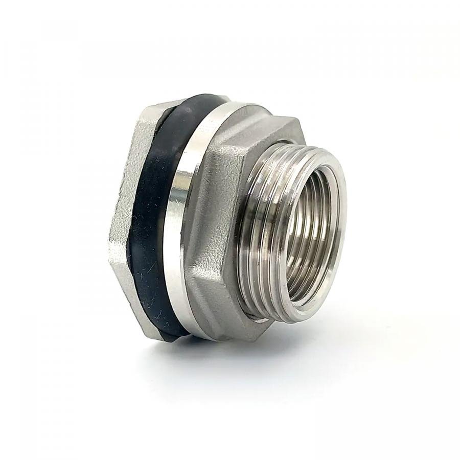 Штуцер, врезка в бак (емкость) с прокладкой, с контргайкой из нержавеющей пищевой стали AISI 304, предназначен для присоединения трубы, шарового крана и любого другого оборудования при помощи резьбового соединения к емкости.
