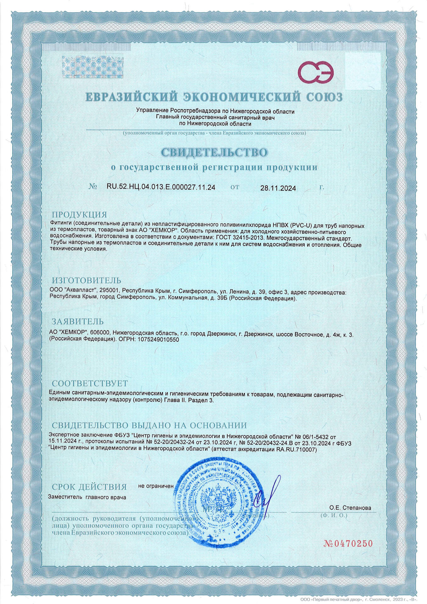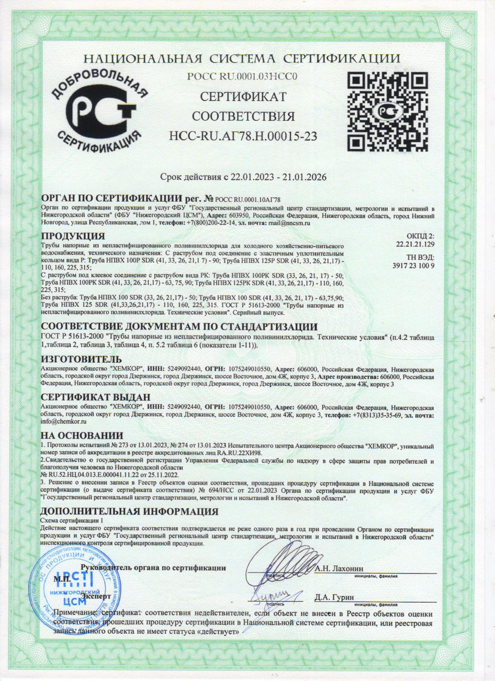 Хемкор - один из крупнейших в России производителей труб и фасонных изделий из НПВХ (непластифицированный поливинилхлорид) для напорных систем водоснабжения, наружных и внутренних канализационных систем, а также обсадных труб и напорных шлангов LayFlat (гибкие трубопроводы из ПВХ).