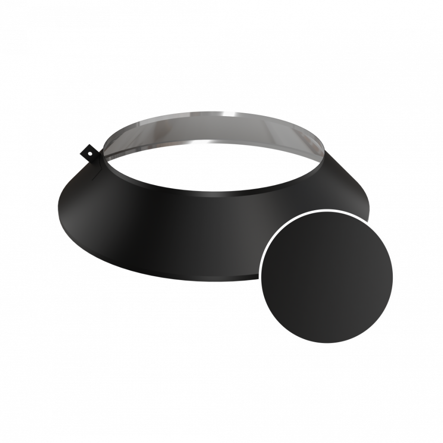 Элемент для предотвращения протечек в подкрышное пространство, используется в местах прохода дымохода сквозь потолочно-проходной узел, или в местах прохода дымохода через стену, как декоративный элемент. Изготовлен из аустенитной стали AISI 304, толщина стенки 0,5 мм. Окрашен в черный матовый цвет термостойкой эмалью