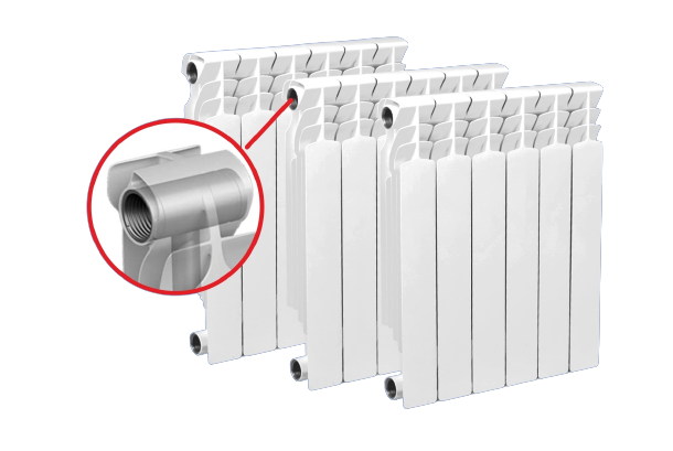 - При изготовлении секции радиатора, цельная Н-образная закладная деталь заливается алюминием в пресс-форме. Такая конструкция
